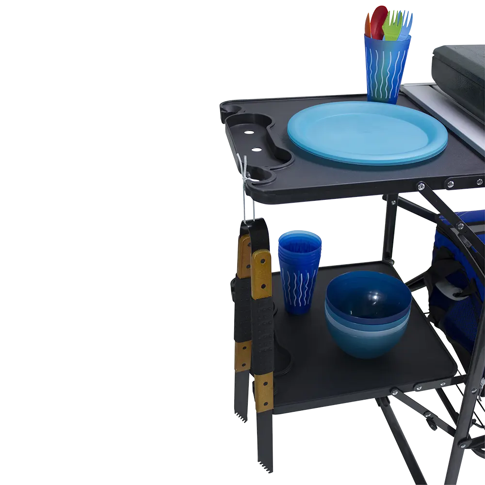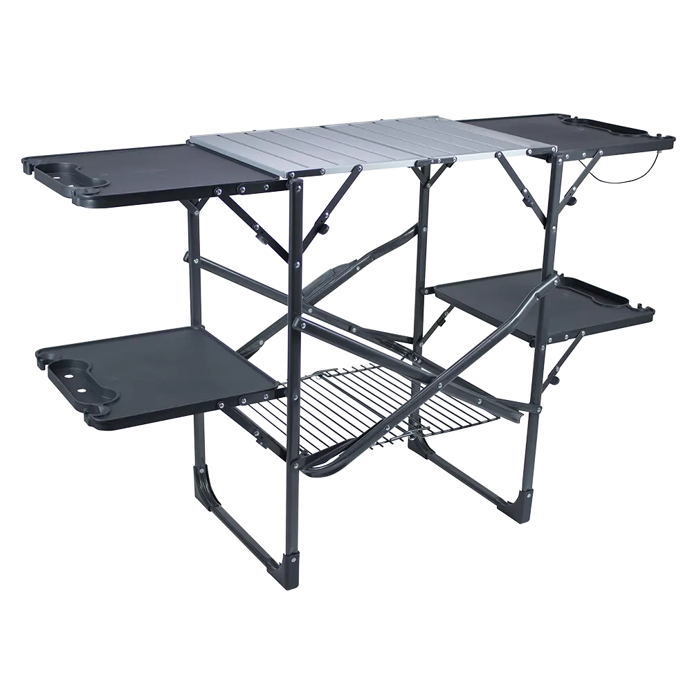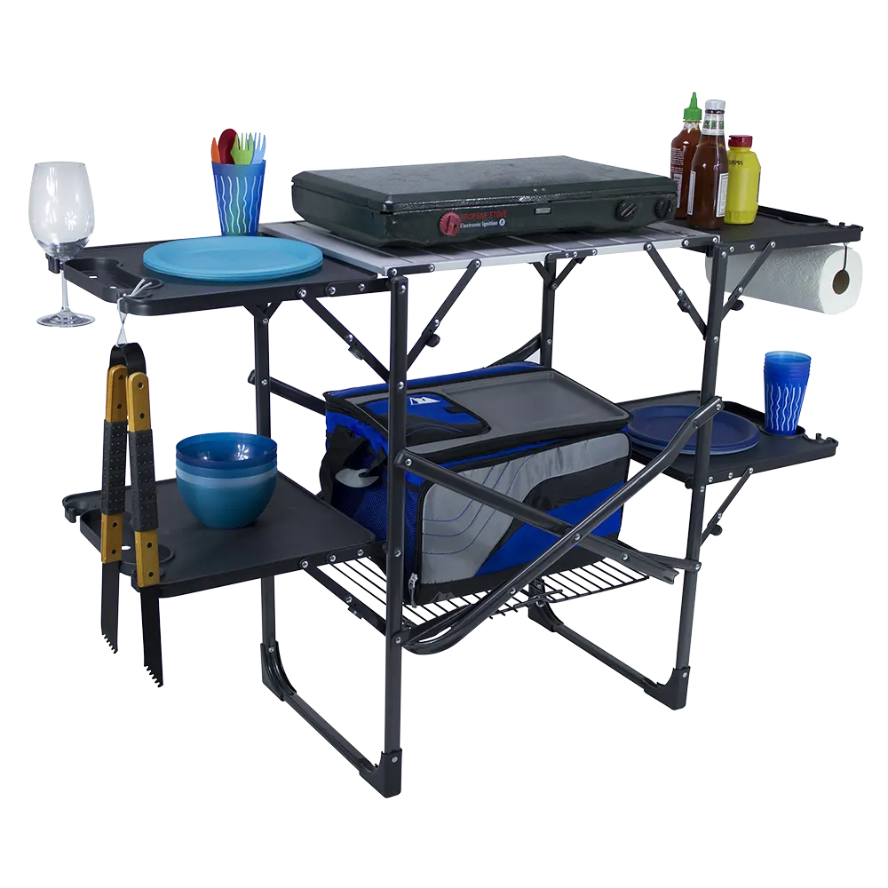 The Slim-Fold Cook Station is the ultimate solution for hassle-free outdoor cooking. This cook station is designed with convenience in mind, featuring fold-out side tables and hooks for easy storage of trash bags or utensils. The heat-resistant aluminium tabletop ensures a safe and stable surface for your camp stove, while the Slim-Fold technology allows the frame to fold flat for compact portability. With a built-in carry handle, transporting this cook station to your favourite outdoor spot is a breeze. Elevate your outdoor cooking experience with the Slim-Fold Cook Station, where functionality meets portability for a seamless culinary adventure.